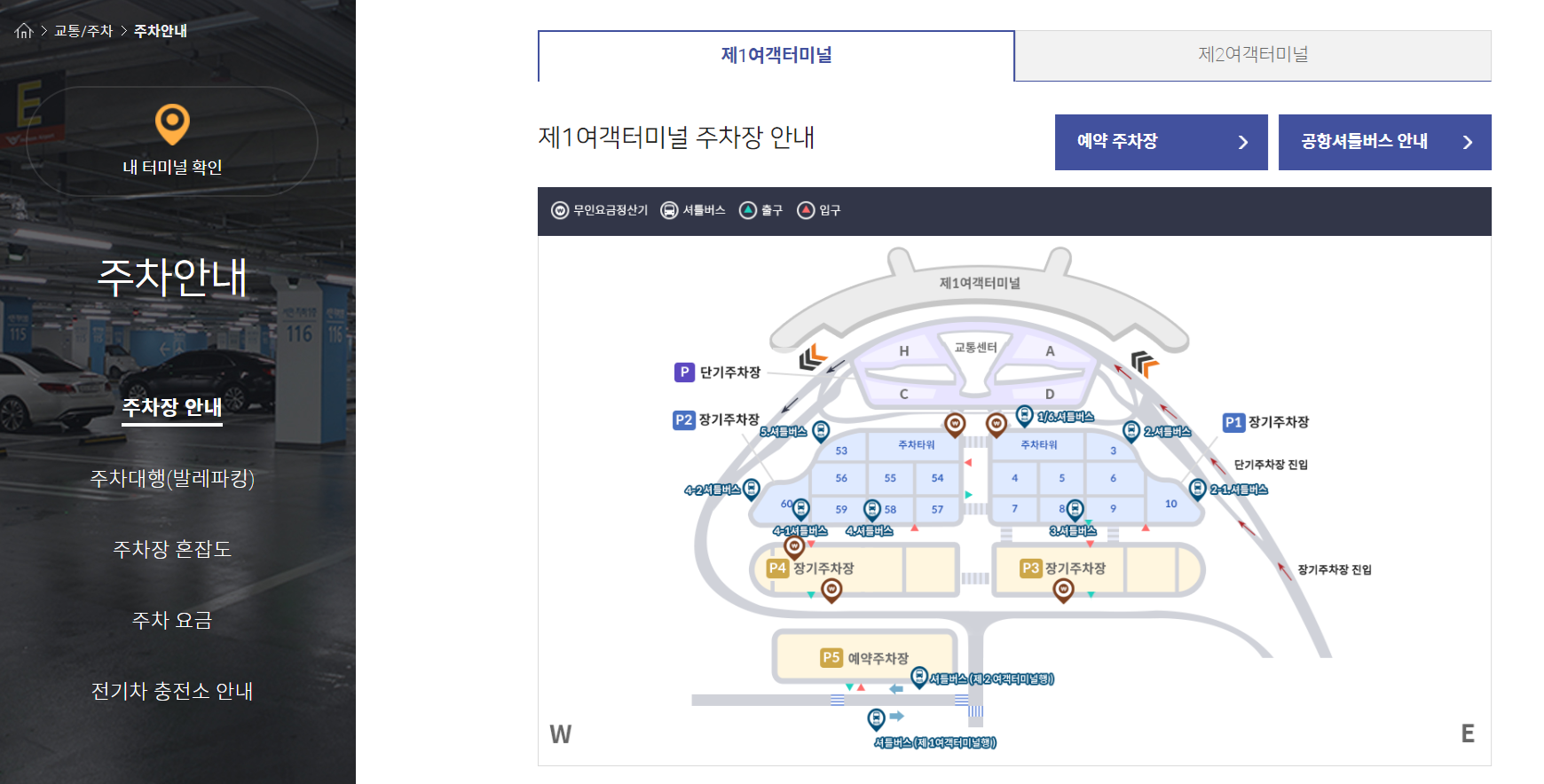 - 홈페이지 첫 화면에서 주차 예약을 원하는 구역을 선택합니다. (제1여객터미널, 제2여객터미널)